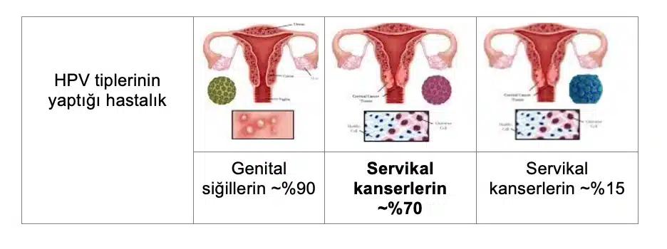 | HPV tiplerinin yaptığı hastalık | Genital siğillerin ~%90 | Servikal kanserlerin ~%70 | Servikal kanserlerin ~%15 |